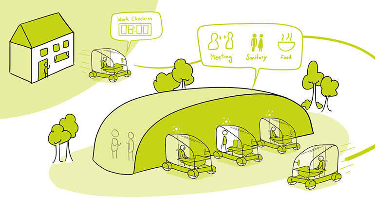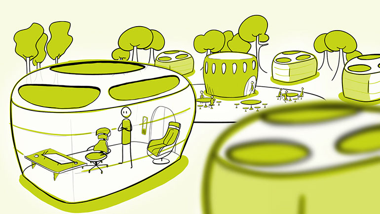 "With increasing health awareness, the work environment is also being reconsidered. The office takes place partly in the open air or under air and light-permeable domes. Smells, fresh air, daylight and gardening opportunities restore the relationship between people and nature for the benefit of work ethic and mental health."