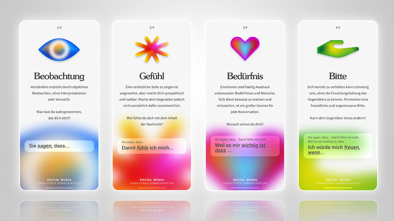 The four stages of nonviolent communication are presented alongside their icon and an exemplary phrasing.